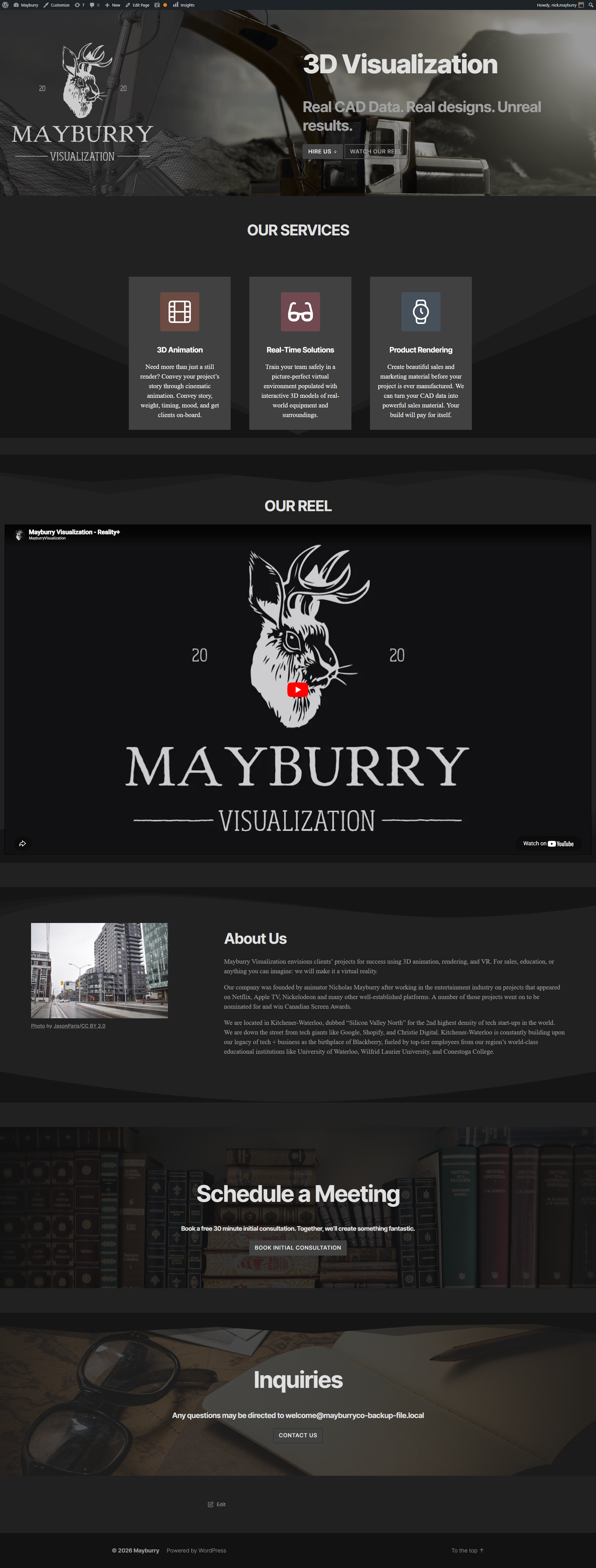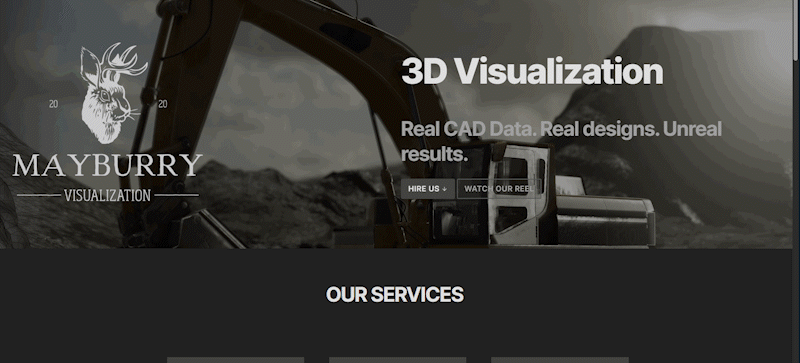In 2020 I began offering freelance services, focusing primarily on 3D visualization. I built a simple WordPress website as a front page for my business "Mayburry Visualization". My freelance work primarily comes through referrals now and the website is no longer hosted, but you can view screenshots from my offline backups below.